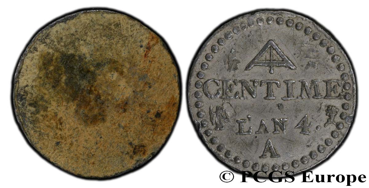 Cette photo, d’assez mauvaise qualité, provient du Mazard au numéro 312. La pièce n’est pas référencée dans le Guilloteau. L’avers arbore la Marianne de Dupré avec la légende REPUBLIQUE FRANCAISE. Le revers porte la légende CENTIME L’AN 4 A avec les différents Artemis (Augustin Dupré, graveur général) et corne d’abondance (Louis-Alexandre Roëttiers, directeur). À la place de la valeur figure un niveau, symbole de stabilité et d’équilibre, comme pour montrer que le nouveau système monétaire est restructuré sur des bases saines.