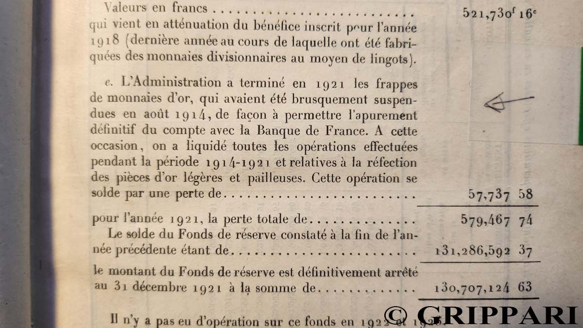 UN PEU DE CONTEXTE HISTORIQUE Le contexte historique qui a conduit in fine à l’arrêt définitif de la frappe des Marianne Coq est très particulier et même unique pour ce type monétaire emblématique de la numismatique française. Pour l’appréhender, il faut se replacer juste avant l’entrée en guerre de la France, c’est-à-dire au tout début 1914. À cette époque, comme au début de chaque année depuis 1899, la Banque de France passe commande à l’Administration des Monnaies et Médailles (ancêtre de La Monnaie de Paris) de pièces Marianne Coq à frapper au millésime de l’année en cours. Pour cela, elle lui fait livrer la quantité de lingots nécessaire à l’exécution de la commande. Au début du mois d’août 1914, la réalisation de cette frappe est déjà bien avancée (6.517.782 pièces) lorsque qu’éclate le premier conflit mondial. Cet évènement majeur entraîne la suspension immédiate des frappes. Les lingots qui n’ont pas eu le temps d’être monnayés sont gardés dans les coffres de La Monnaie. Ils y resteront jusqu’en 1921, date à laquelle la Banque de France décide de les monnayer à leur tour (202.359 pièces) afin d’honorer la fin de la commande du millésime 1914 et apurer ainsi les comptes respectifs de la Monnaie de Paris et de la Banque de France comme en témoigne ce document officiel :
