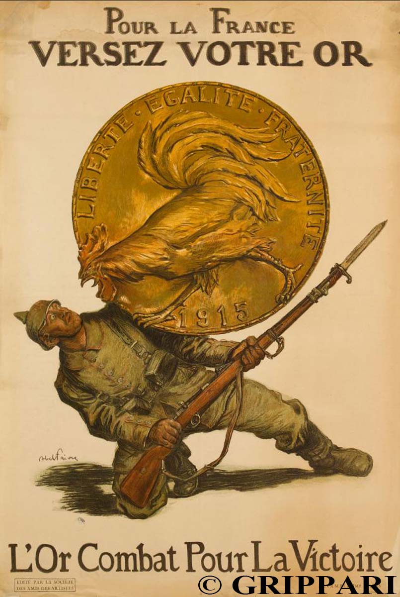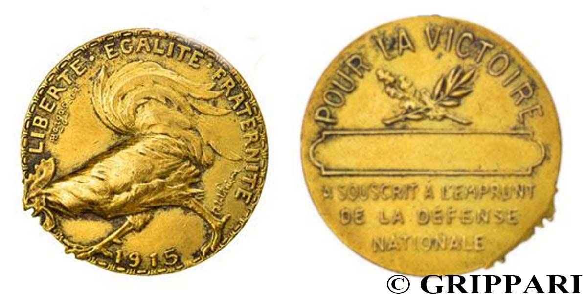 La Marianne Coq 1914 est de fait le seul millésime de ce type monétaire à avoir été frappé en deux temps : la plus grande partie en 1914, avant la déclaration de la guerre, et le reliquat en 1921. Il n’y a donc jamais eu de refrappe en 1921 comme on le voit souvent écrit dans la presse numismatique mais simplement la conclusion d’une frappe initiée sept années plus tôt. Depuis cette époque, aucune frappe officielle de Marianne Coq n’a été décrétée : il est donc impossible d’observer des pièces authentiques portant un millésime postérieur à 1914. LES FAUX MILLÉSIMES DANS LA PRESSE Et pourtant, la littérature numismatique au sens large (presse, catalogues, sites internet, ventes aux enchères) s’est sporadiquement faite l’écho de la découverte de Marianne Coq ayant un millésime postérieur à 1914. Les publications sont cependant rares et se contentent le plus souvent d’évoquer des contrefaçons d’origine russe, italienne ou libanaise. Malheureusement, aucune preuve documentée ni aucune source vérifiable n’est fournie à l’appui de ces publications. On a de ce fait la désagréable impression d’une légende urbaine toujours d’actualité. Pour tenter d’y voir un peu plus clair, on peut néanmoins avancer qu’il est peu probable que des états étrangers aient eux-mêmes planifié et organisé un tel faux-monnayage (sauf peut-être l’URSS, pour cause de guerre froide…). Il faut plutôt comprendre qu’il s’agit d’une référence à l’ascendance généalogique, communautaire, culturelle ou encore technique de faussaires dont la patte est parfois identifiable grâce à la qualité de leur production ou à certains détails de gravure. Par abus de langage, on parle même d’écoles de faux-monnayage, l’une des plus connues étant probablement l’école italienne de Montecatini Terme (en Toscane) qui a beaucoup œuvré au milieu du XXe siècle (années 50-70). Quoi qu’il en soit, l’existence voire la circulation de Marianne Coq millésimées 1915 ou 1916 étant avérée, le numismate se perd en conjectures pour tenter d’expliquer cet anachronisme. Deux camps se font face : ceux, très majoritaires, qui pensent d’emblée à des contrefaçons et ceux, très minoritaires, qui n’excluent pas des pièces authentiques. Si l’on penche plutôt pour des contrefaçons, il est possible d’évoquer : - une étourderie voire une méconnaissance de la part d’un faussaire peut-être influencé par le millésime 1915 figurant sur une médaille gravée par Armand Bargas sur un dessin d’Abel Faivre (voir ci-dessous). Cette médaille met en scène un coq gaulois vindicatif. Elle a été reprise par le même Abel Faivre sur la célèbre affiche ci-dessous : Si l’on est plutôt partisan de l’authenticité de ces pièces, on peut évoquer des frappes d’essais réalisées de façon très confidentielle par l’État français lui-même. Cette hypothèse est bien entendu hautement spéculative mais peut éventuellement se comprendre au regard du contexte historique. En effet, beaucoup d’officiels de l’époque ainsi qu’une grande partie des militaires eux-mêmes étaient convaincus que la guerre serait de courte durée. L’optimisme était de rigueur : on partait au front « la fleur au fusil », persuadé que la guerre serait vite finie, possiblement dès 1916… On trouve d’ailleurs une trace de cet état d’esprit sur des timbres des cours d’instruction des Postes surchargés « guerre 1914-1916 » (voir photos ci-dessous). Avec une pointe de malice, on peut donc imaginer que cet état d’esprit a peut-être aussi incité à frapper des pièces arborant un millésime qui sentait bon une issue rapide du conflit, un peu comme une prophétie autoréalisatrice… Et en ce qui concerne l’État, ces frappes auraient permis d’anticiper une reprise rapide de la circulation de l’or dès la fin du conflit (les coins étaient prêts !) et ainsi de constituer une aide précieuse au redémarrage de l’activité économique du pays. Pour ceux qui sont persuadés que l’État français n’oserait jamais se prêter à de telles manœuvres frauduleuses, on rappellera que, quelques années plus tard, il n’hésitera pas à faire frapper en secret des millions de copies de Marianne Coq démonétisées (bien mal dénommées « refrappes Pinay ») qui ont ensuite été vendues sur le marché de l’or durant au moins six mois (de mai 1951 à janvier 1952) sans que le public soit au courant : donc, pour le dire plus crûment, au noir ! (2) Ce n’est en effet que, contraint et forcé par la réaction du marché, que le ministère des Finances s’est résolu à reconnaître publiquement la supercherie en publiant le 30 janvier 1952 un communiqué resté célèbre (3). Toutefois, et en dépit de cet aveu ministériel, aucun décret ni aucune loi n’ont jamais donné, même a posteriori, la moindre existence légale à ces copies… qui sont donc bien ipso facto des faux d’État. LE MILLÉSIME 1915 DANS LA PRESSE De rares notules dans des catalogues ou revues numismatiques francophones ainsi que quelques posts dans des forums spécialisés ont relaté la découverte de Marianne Coq millésimées 1915. Ces pièces sont le plus souvent décrites comme de taille et de poids normaux. Cependant, leur composition chimique par spectrométrie X n’étant jamais précisée, il n’est pas possible de savoir si leur titre en or est droit. La notule la plus facile à consulter est celle parue dans la défunte revue Numismatique & Change, n°313, février 2001, page 27. Elle est à l’initiative de l’association « Les Amis du Franc » et comporte une reproduction recto-verso et en couleurs de l’une de ces pièces :