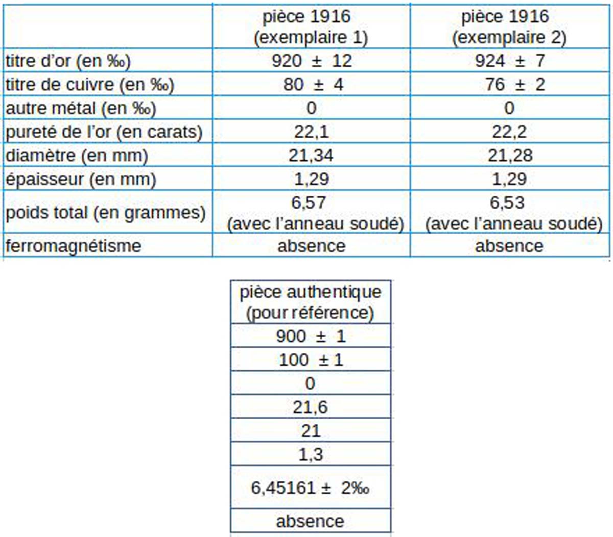 UN MILLÉSIME 1923 ? S’il existe vraiment, ce serait un ovni encore plus surprenant que les millésimes 1915 ou 1916. Il n’est d’ailleurs cité ici que pour mémoire car aucune vérification n’a pu être faite. On sait seulement que deux pièces à ce millésime ont été proposées en 2018 dans une vente aux enchères sur internet, par une maison réputée (6). Si la photographie du lot ne permet pas de visualiser ces pièces, le descriptif mentionne bien, 2x 1923… À suivre donc au cas où elles reviendraient dans le circuit des ventes… Si elles existent réellement. LES PIÈCES MILLÉSIMÉES 1916 OBJETS DE CET ARTICLE Les pièces qui sont l’objet de cet article sont donc des 20 francs Marianne Coq millésimées 1916. Elles figuraient dans la catégorie « bijoux » de l’épais catalogue de vente aux enchères d’une maison parisienne (10). Décrites comme « monnaies montées en pendentifs », elles comportaient effectivement un minuscule anneau soudé sur la tranche, au-dessus de la tête du coq. Pour la petite histoire, le même catalogue proposait deux autres exemplaires de 20 francs Marianne Coq montées en pendentifs mais avec cette fois un millésime 1912. Malgré la bonne volonté du Commissaire Priseur, le vendeur n’a pas répondu aux demandes de renseignements complémentaires, notamment en ce qui concerne l’origine des pièces. La seule information obtenue auprès de l’organisateur de la vente est qu’il s’agit probablement d’une succession donc difficile de remonter à la source… Après un examen minutieux, les quatre pièces (les deux 1916 et les deux 1912) se sont révélées fausses. Les principales caractéristiques physiques des deux pièces 1916 sont résumées dans le tableau ci-dessous :