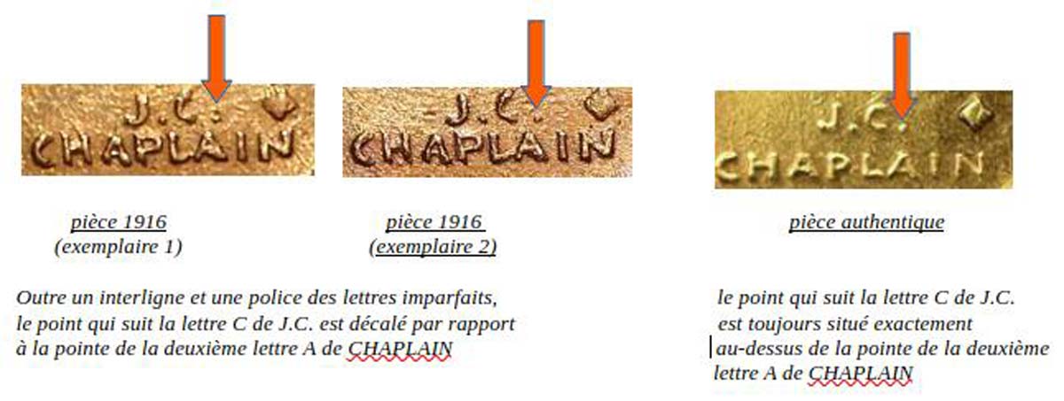 L’axe des coins est à 6 heures (frappe monnaie). La surface de l’avers et du revers est jaune et brillante comme si elle avait subi un polissage, ce qui n’est vraisemblablement pas le cas. Absence de stries de polissage. Les photographies montrent une gravure de belle facture des deux faces de chaque pièce. Néanmoins, quelques détails d’importance « clochent ». Sur l’avers, la gravure de l’effigie de Marianne est dans l’ensemble correcte mais la signature du graveur J.C. CHAPLAIN est très anormale. On note en particulier : Sur le revers, l’anomalie la plus évidente est bien sûr le millésime 1916 impossible. La police utilisée pour l’inscrire semble assez proche de celle de la pièce vendue aux enchères le 29/11/2015 (9), suggérant une possible communauté d’origine (même atelier de contrefaçon ?) : La tranche présente un aspect d’ensemble qui peut tromper un coup d’oeil trop rapide. Elle comporte la gravure en relief de la devise républicaine +* LIBERTE +* EGALITE +* FRATERNITE *+ et il ne manque aucun motif ni aucune lettre. Cette devise est lisible seulement lorsque le coq (revers) est la face supérieure : c’est donc une tranche B. Toutefois, un examen plus attentif montre un mauvais centrage vertical du texte ainsi que diverses imperfections dans la gravure des lettres et motifs :