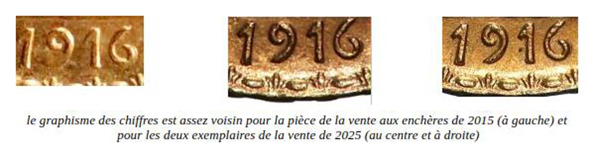 On notera avec intérêt que les pièces 1915 signalées ne sont pas toutes identiques : ainsi, la gravure du millésime varie selon la source, notamment celle du chiffre 5 comme le montre la photo ci-dessous : Cela implique que plusieurs coins ont été fabriqués, au moins un pour chaque origine frauduleuse. Par contre, aucune source vérifiable n’a été communiquée. C’est donc toujours une affaire à suivre car beaucoup de caractéristiques manquent (spectrométrie X par exemple). LE MILLÉSIME 1916 DANS LA PRESSE Le millésime 1916 est apparemment encore plus rarement rencontré puisque seuls deux signalements ont été trouvés dans la presse. Le premier correspond à une question posée par un lecteur dans la rubrique « Service Lecteur » de la revue Numismatique & Change, n° 361, juin 2005, page 67. Le lecteur communique la reproduction en noir et blanc d’une pièce millésimée 1916 et se pose la question de son authenticité et de sa signification. La photo est de trop mauvaise qualité pour être reproduite ici. On parvient à peine à distinguer le millésime 1916. La pièce est décrite comme normale en taille et en poids. Elle porte des traces d’usure et de nettoyage. La consultation des dix numéros suivants de la revue n’a malheureusement pas permis de lire la moindre réponse à l’appel à l’aide du lecteur. Une réponse plus tardive a peut-être été faite mais les numéros ultérieurs de la revue n’ont pas pu être consultés (introuvables). Le second signalement correspond à une vente aux enchères sur internet datée du 29/11/2015 (9). La pièce n’est pas documentée mais l’annonce comporte deux belles photographies recto-verso et en couleurs. On constate que la pièce est globalement de bonne facture et que la gravure ne présente que peu d’anomalies (patte gauche du coq incomplète, signature CHAPLAIN imparfaite, oves de taille irrégulière…) :