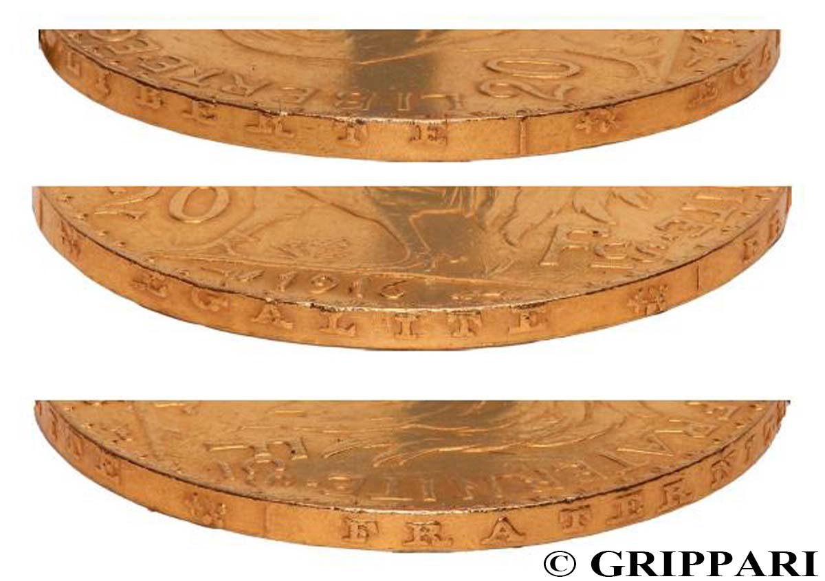 La photo ci-dessous résume l’aspect global de la tranche : Enfin, on ne constate pas d’anomalies lors de l’étude des correspondances entre, d’une part, les motifs gravés sur le listel de l’avers et du revers et, d’autre part, les lettres gravées en relief sur la tranche. Il n’y a donc pas de malposition de l’un par rapport à l’autre (pas de coin tourné). CONCLUSION Les faux d’époque des millésimes 1915 et 1916 de la pièce de 20 francs or au type Marianne Coq sont un sous-thème déconcertant et difficile à collectionner en raison de la rareté de ces pièces. L’heureuse découverte récente de deux exemplaires millésimés 1916 permet d’écarter l’hypothèse de faux d’Etat. Il s’agit donc de contrefaçons clandestines. L’atelier du faussaire n’a pas pu être identifié mais la bonne qualité générale de la gravure et la composition chimique (léger excédent d’or) font plutôt évoquer une origine suisse ou italienne que russe (mais bien entendu sans aucune preuve certaine et vérifiable). D’autres exemplaires de ces millésimes impossibles devront être réunis et étudiés pour tenter d’en savoir davantage. Dans cette optique, l’avis et l’aide de la communauté numismatique sont indispensables. Jean-Luc GRIPPARI REMERCIEMENTS L’auteur tient à remercier chaleureusement : RÉFÉRENCES BIBLIOGRAPHIQUES 1 – Administration des Monnaies et Médailles : Rapport au Ministre des Finances, 1919-1923, 22e année, Paris (1923)
