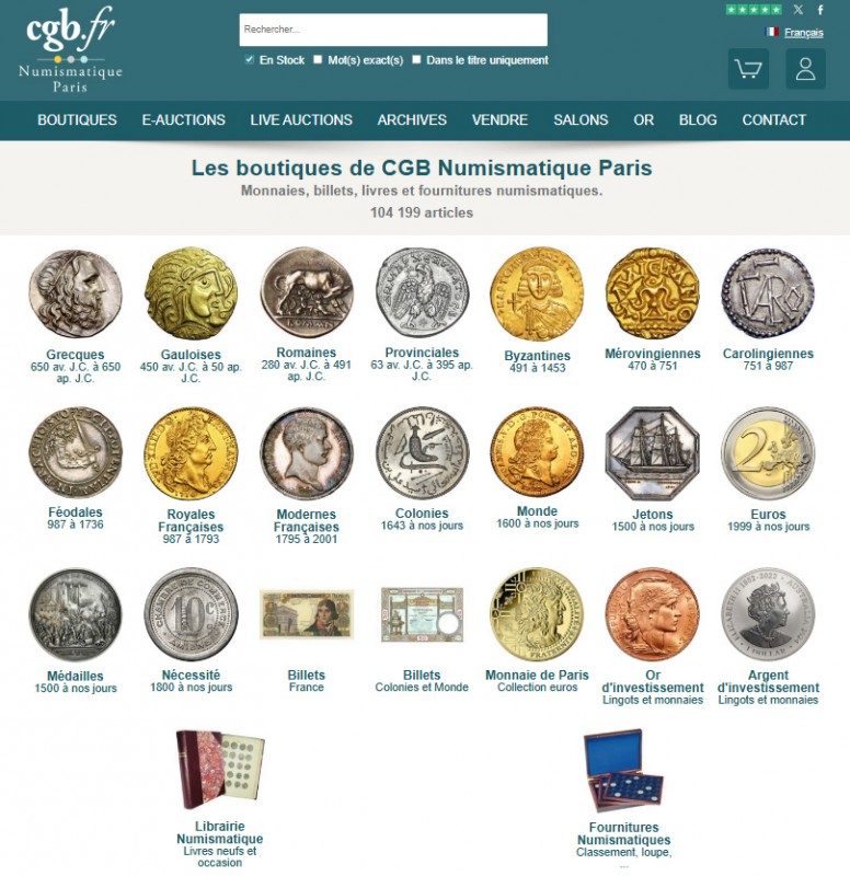 Chaque mois dans le Bulletin Numismatique, nous vous présentons des exemplaires issus des Live Auctions ou des Internet Auctions en cours. Mais en dehors de ces événements qui rythment la vie de Cgb.fr, vous pouvez retrouver sur la Boutique vingt-trois boutiques spécialisées : des monnaies grecques aux fournitures numismatiques, en passant par les jetons, les médailles, les billets, la librairie numismatique, les euros, les produits de la Monnaie de Paris, l’or et l’argent d’investissement.