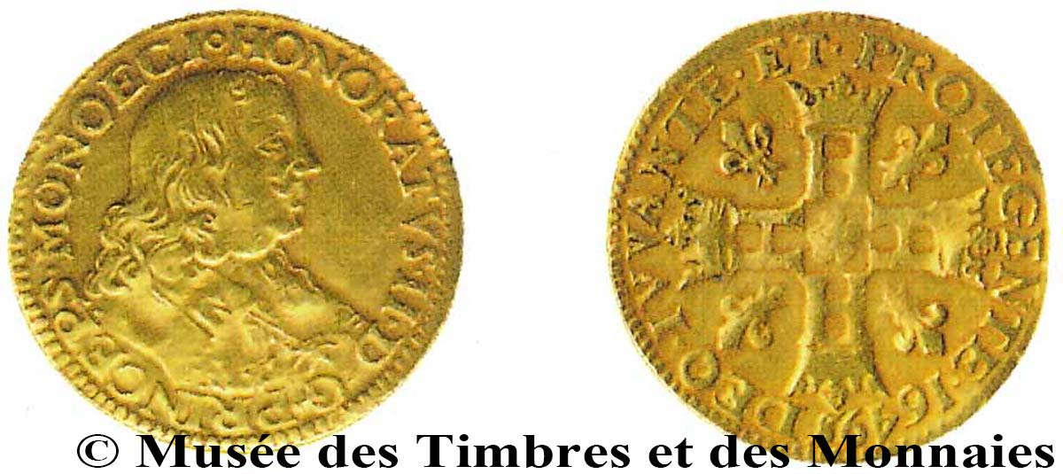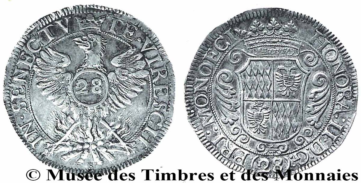 • Le tallero au phénix, vers 1660, connu à 2 exemplaires (fig.7), sans doute créé à l’occasion du mariage du futur Louis Ier, petit-fils et successeur d’Honoré II. Cette extraordinaire monnaie aux armes paternelles (Grimaldi) et maternelles (Valdetare) d’Honoré II évoque à travers cet événement le « passage de témoin » du vieillard Honoré II à son très jeune petit-fils (18 ans) grâce au symbole du phénix renaissant de ses cendres. Cette monnaie d’exception n’avait pas cours en France mais pouvait circuler au Levant.