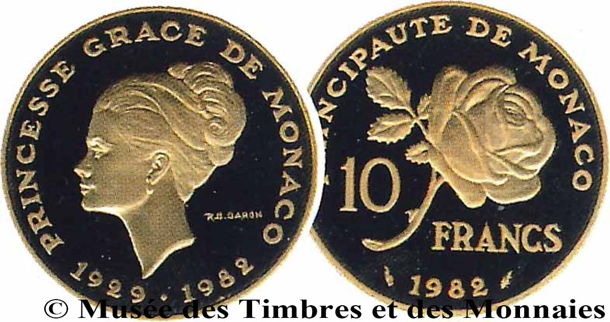 • L’essai en or de la magnifique pièce de 10 francs gravée par Roger Bernard Baron après le décès tragique de la princesse Grace en septembre 1983. Au revers figure une rose, symbole privilégié de la défunte (fig.10).
