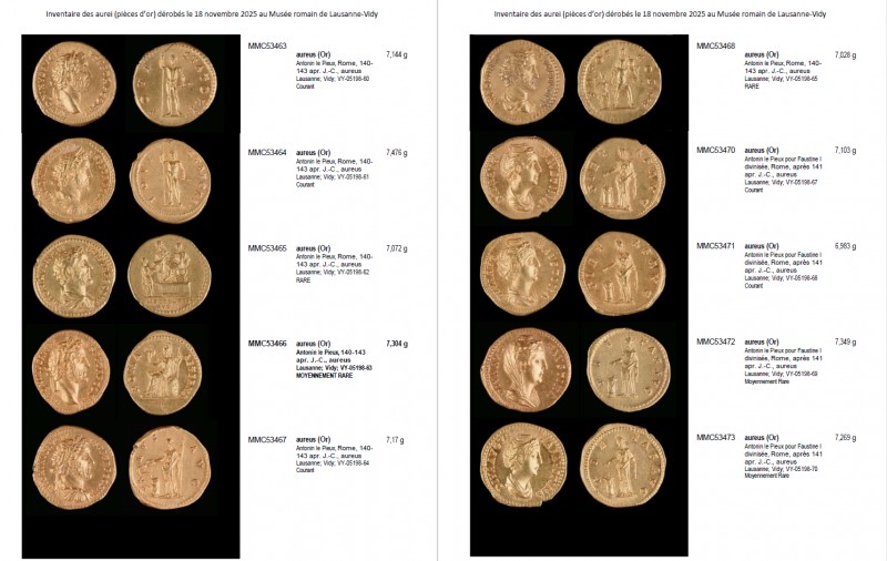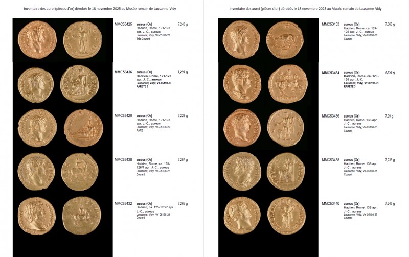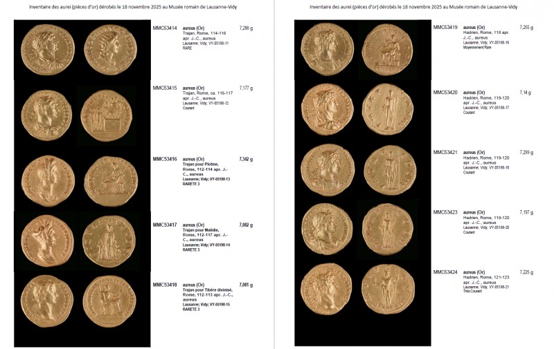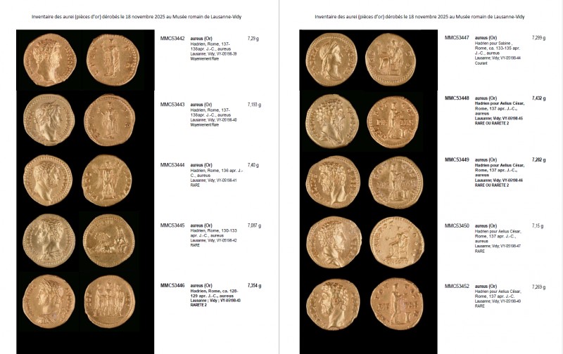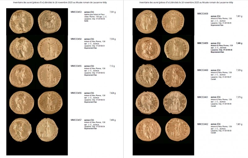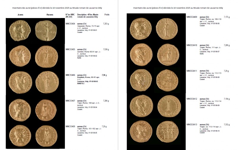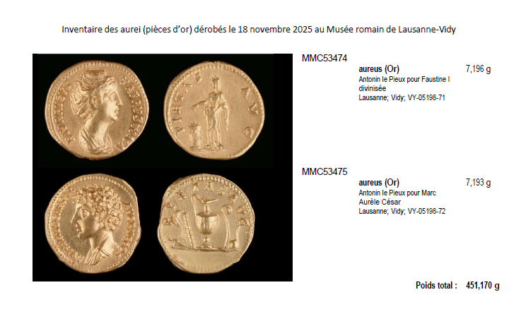 L'inventaire des aurei dérobés le 18 novembre 2025 au Musée romain de Lausanne-Vidy a été établi, vous en trouverez le détail ci-dessous. Si vous disposez d'informations au sujet des ces monnaies, constatez par exemple la présentation dans une vente ou sur des sites tels Ebay, veuillez contacter directement la police de Lausanne. La personne à contacter est l'inspecteur Juan Taibo.