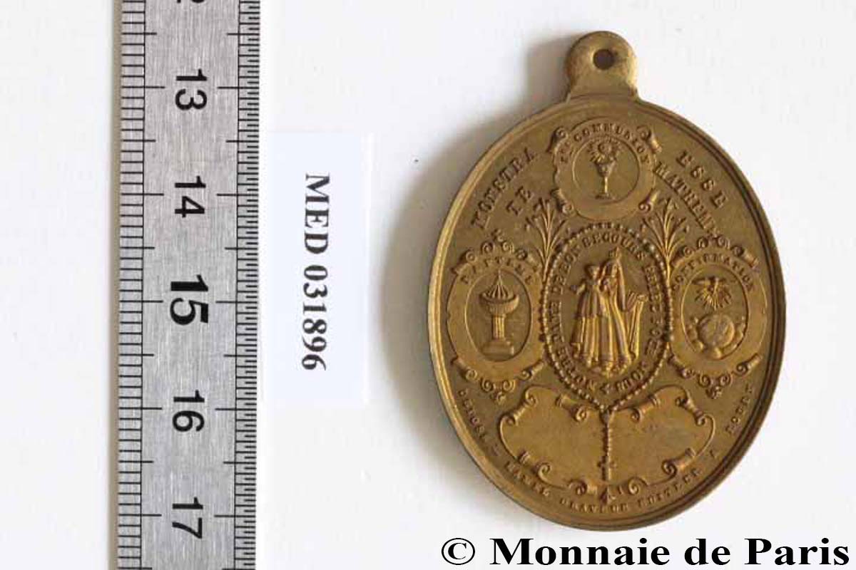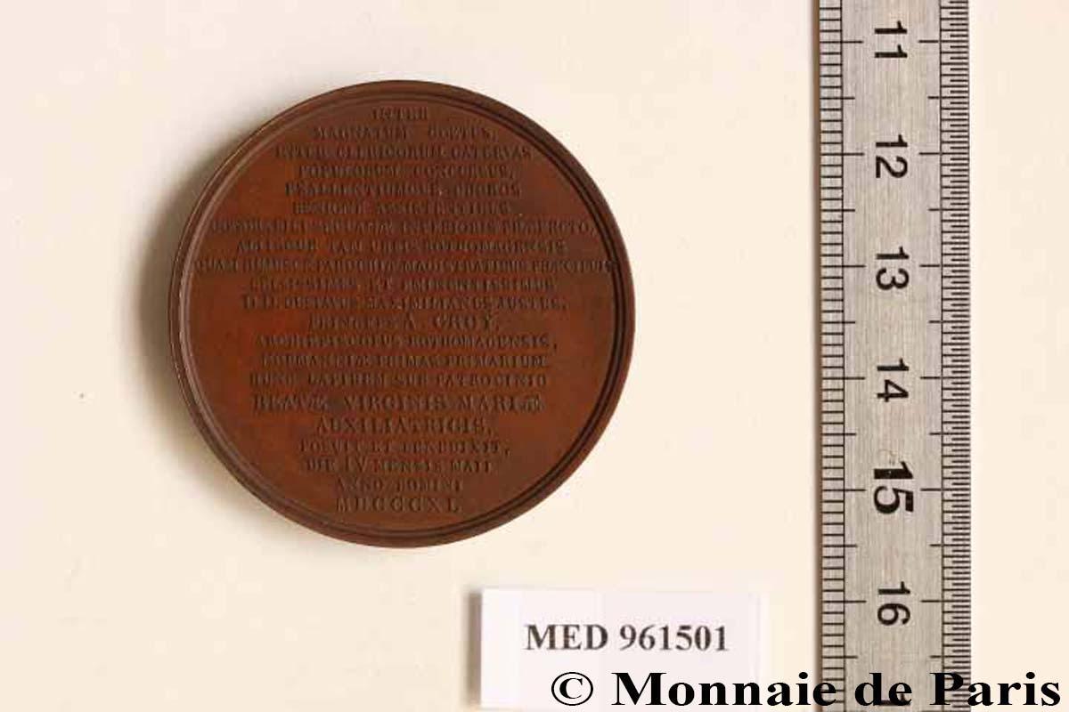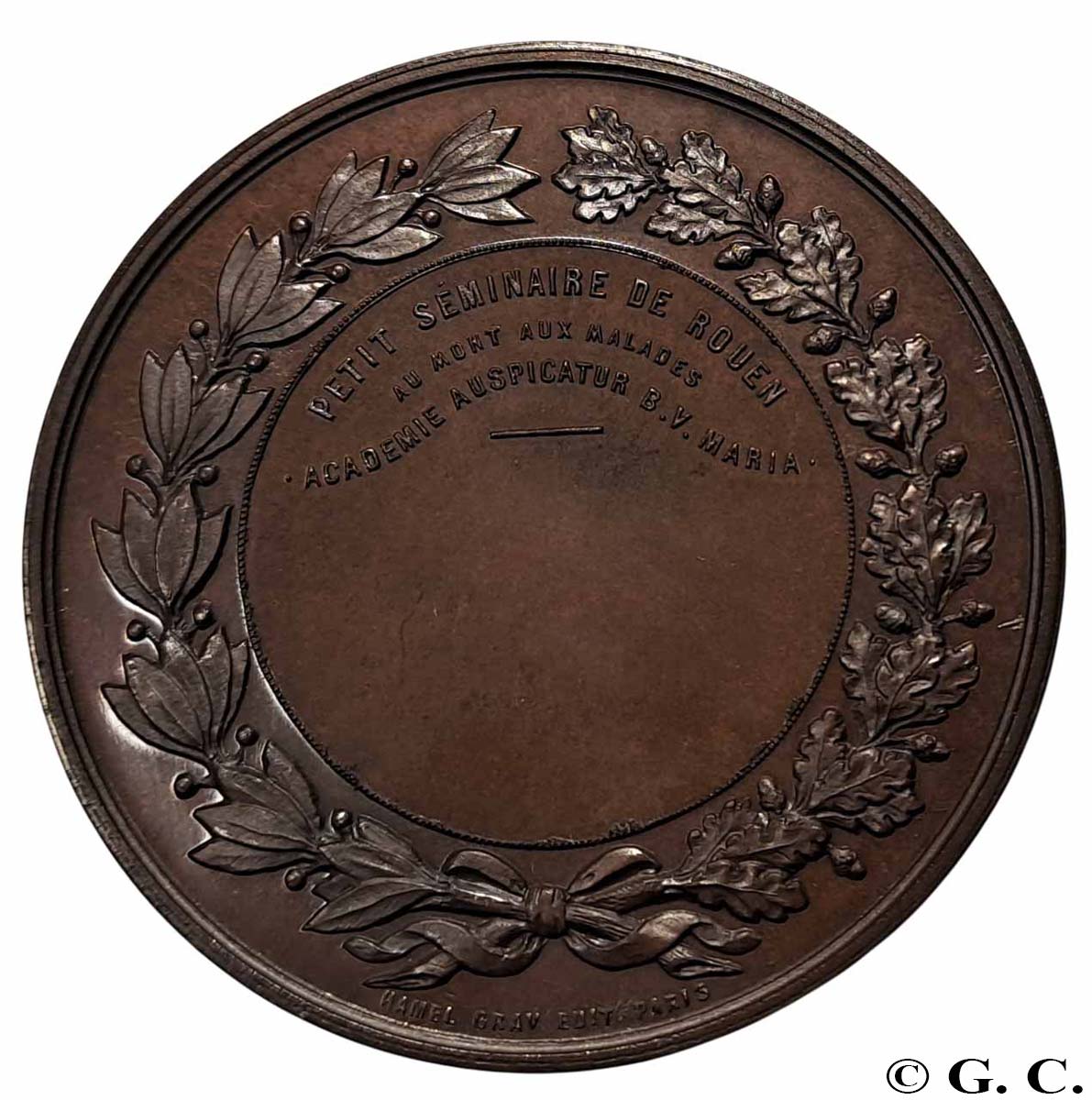 Le graveur enchaîne alors plusieurs commandes liées à ces événements particuliers que sont les Expositions. Il conçoit les médailles de récompenses et de souvenirs de l’Exposition internationale maritime du Havre21 en 1868 par exemple. 1869, puis 1870 sont des années d’inflexion dramatique. Hamel continue d’enregistrer les commandes (Exposition industrielle de Beauvais par exemple). Mais alors qu’il s’apprête à sortir des frontières françaises pour participer à l’exposition d’Altona, en Prusse, à la fin août – il lui sera décerné une médaille d’argent à cette occasion, une véritable tragédie survient. À la mi-août, à l’occasion d’un voyage à destination de l’Italie, sa femme et sa fille disparaissent dans le lac du Bourget, victimes d’un chavirage d’embarcation dont lui-même réchappe22,23. Les corps des deux malheureuses ne seront jamais retrouvés. Et puis quelques mois plus tard, son domicile parisien est vraisemblablement sinistré pendant la Commune. Il est très probable qu’il revienne à cette période sur Rouen24, pour quelque temps, avant de s’installer de nouveau à Paris, à une autre adresse, vers 1872-73, jusqu’à sa mort. Quand il revient dans la capitale, il exécute encore quelques commandes, parfois en provenance de Normandie, à l’instar d’une médaille de récompense pour le compte du Petit Séminaire de Rouen, en 187425. Néanmoins, le rythme s’est considérablement ralenti, puisque seule une dizaine de modèles apparaît au dépôt légal entre 1871 et 1879 – au cours de la seule année 1866, il en avait réalisé 12. Il décède à Paris le 26 juin 1879, à l’âge de 59 ans, manifestement des suites d’une longue maladie – les remaniements successifs de son testament26 au cours des six derniers mois de sa vie en semblent une indication. Sa mort est déclarée par un ami, Louis Leclerc, qui réside à Rouen, et par son frère cadet, Ulysse. Ce dernier reprendra ponctuellement le flambeau fraternel, en réalisant notamment deux médailles pour Notre Dame de Bonsecours : l’une pour célébrer le couronnement en 1880, l’autre pour commémorer sa consécration en 188527. Il laisse derrière lui une œuvre riche d’au moins une centaine de modèles originaux – un chiffre clairement sous-estimé au regard des « trous » dans les sources d’informations le concernant à plusieurs périodes. Son souvenir s’efface bien rapidement alors qu’il bénéfice à son époque d’une reconnaissance de son talent qu’il paraît difficile de contester, mais qui ne nous est pas parvenue en tant que telle. Il ne semble avoir été l’élève, ou le maître d’aucun graveur. Son absence dans les salons et expositions en tant que graveur, pour présenter son travail, est sans doute aussi préjudiciable. Enfin, l’absence de toute descendance familiale directe n’est pas de nature à favoriser l’entretien de sa mémoire. Pourtant, son activité professionnelle lui survit d’une certaine manière : le commerce qu’il a fondé cours Boieldieu perdure pendant plusieurs décennies28, de manière particulièrement éclatante avec ses deux premiers successeurs : Adolphe Lecomte jusqu’en 1879 puis Adolphe Noël jusqu’au début du 20e siècle. Ces deux graveurs ont également produit des médailles remarquables - leurs deux inventaires combinent une centaine de modèles, mais c’est là une autre histoire. Guillaume CHASSANITE ANNEXE – médailles et jetons Hamel