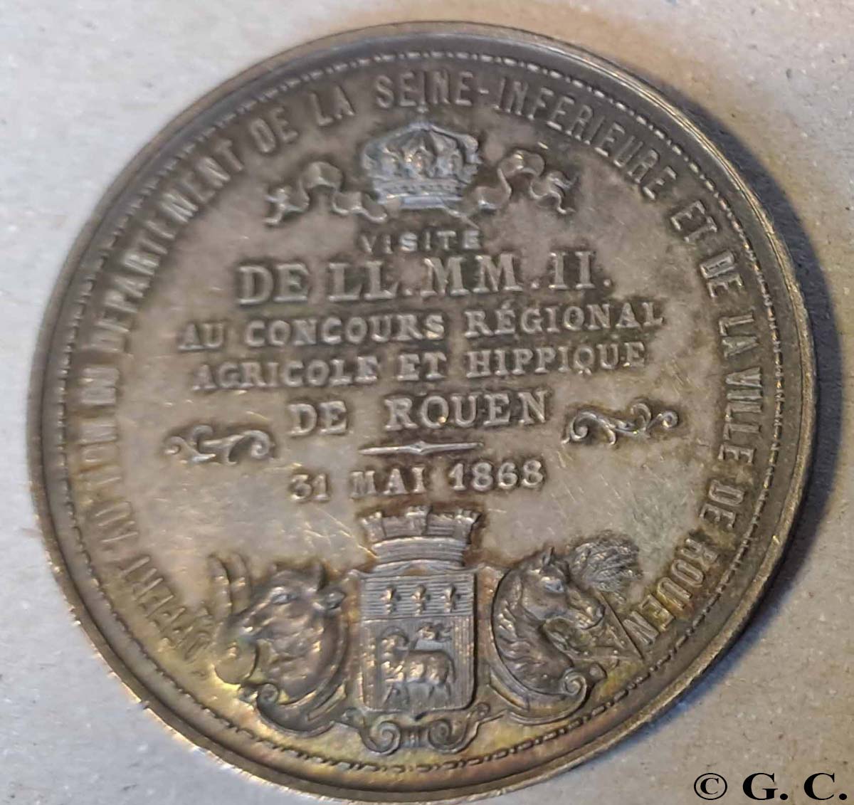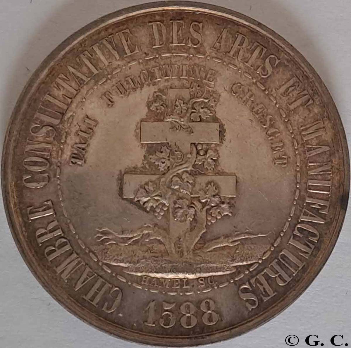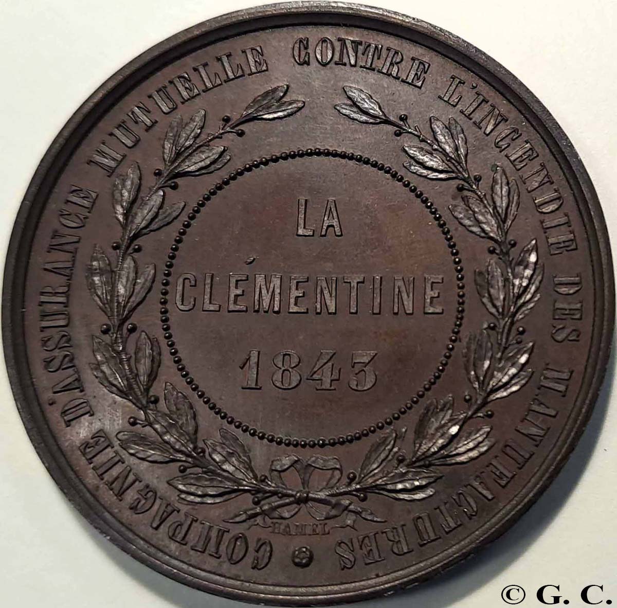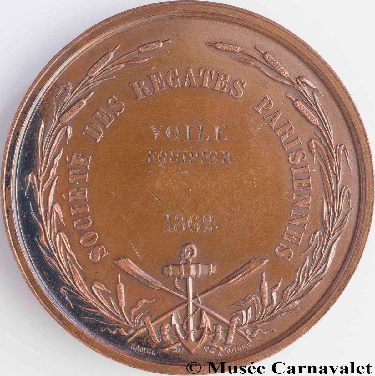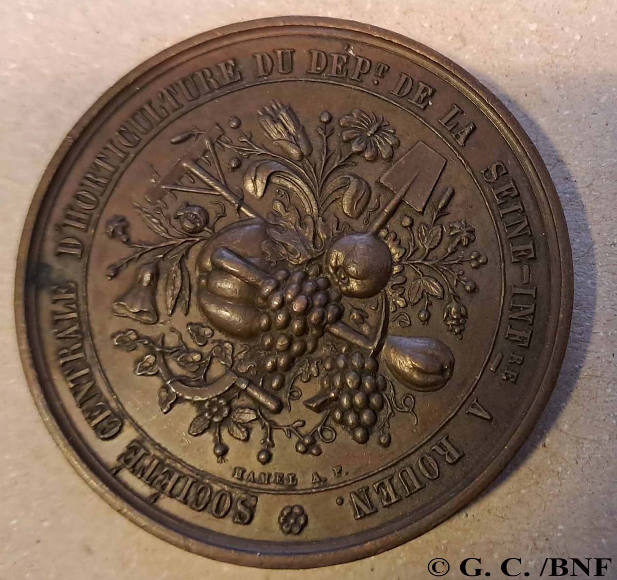 L’ÉMANCIPATION DE LA SEINE-INFÉRIEURE VIS-À-VIS DES GRAVEURS PARISIENS | 20/04/2026 Informations ACHILLE HAMEL, TRAJECTOIRE D’UN MÉDAILLEUR OUBLIÉ1 « La gravure en médailles n’a dans notre ville qu’un seul et digne représentant : c’est M. Hamel, qui a, de plus, l’honneur d’avoir implanté à Rouen cet art qu’il ne paraissait guère possible de faire réussir en province. En dépit des nombreuses difficultés que l’artiste rencontre dans l’obligation d’aborder tous les genres, ce qui n’a pas lieu à Paris, où s’explique ainsi la supériorité des spécialistes, M. Hamel a fait preuve d’un talent aussi sûr que varié dans l’exécution d’une grande quantité de médailles depuis quelques années. (…). L’Académie décerne un rappel de médaille d’argent à M. Hamel » (Précis analytique des travaux de l’Académie des sciences, belles-lettres et arts de Rouen, 1858 p.71) Éclipsés par les artistes de « l’âge d’or » de la médaille, dans les années 1890-1920, bon nombre de graveurs du milieu du 19e siècle restent encore dans l’ombre, malgré toutes les louanges et prix reçus. C’est tout particulièrement le cas d’un homme qui a connu un succès incontestable, d’abord en Normandie, puis au-delà des frontières régionales, à Paris : Achille Hamel. Pendant près de 50 ans, de 1850 à 1900, la création de nouveaux types de médailles en Seine-Maritime (Seine-Inférieure à l’époque) est presque exclusivement attribuable à cet homme, puis à ses successeurs, Lecomte et Noël. 1848-1860, LES ANNÉES ROUENNAISES, L’ESSOR D’UN GRAVEUR En 1848, la première trace d’Achille Hamel résonne comme un coup d’éclat – il a alors 28 ans. Il est récompensé d’une grande médaille de bronze pour la qualité de son travail. L’éloge est particulièrement appuyé : il « nous a fait admirer trois médailles qu’il a exécutées pour la Société d’horticulture de Rouen. Il est impossible de rien voir de plus coquet, de plus gracieux, de mieux travaillé ; les fleurs, les fruits, les outils de jardinage sont gravés avec une rare perfection, et de manière à rivaliser avantageusement avec les plus habiles ouvriers de la capitale.