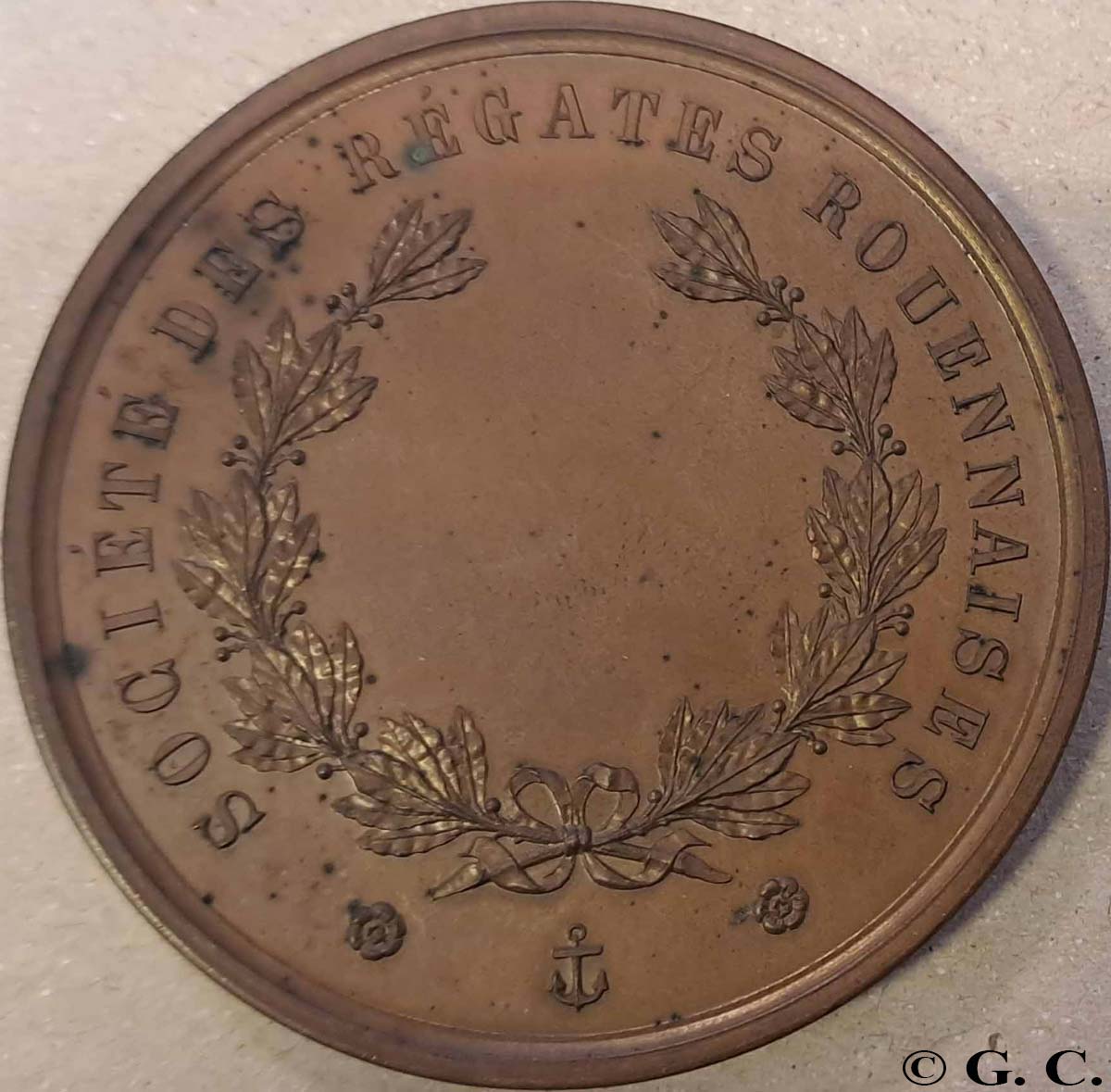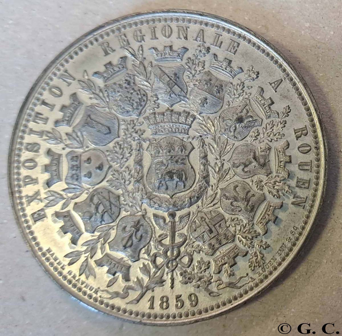 Veuf en 1850, il se remarie en 1852 avec Angélique Baullier6, en février. Le couple accueille une petite fille fin novembre. Cette union correspond à la croissance rapide de sa production de médailles, qui s’explique sans doute par la profession de son épouse, qui est aussi « graveur en métaux ». En quelques années, de nombreux modèles pour des institutions normandes voient le jour. Leur éclectisme est particulièrement frappant : Caisse d’Epargne et de Prévoyance de Rouen7, Société des Régates rouennaises8, Ville de Rouen9, comptoir d’escompte de Rouen10, sans doute la banque la plus réputée de la place normande au 19e siècle, Conseil central d’hygiène et de salubrité de Seine-Inférieure11, ou encore les assurances La Clémentine12. En 1854, il est choisi pour la réalisation du nouveau jeton de présence de la société libre d’Emulation du Commerce et de l’Industrie, fusion de la Société du Commerce et de l’Industrie et de la Société d’Emulation13. Cela lui permet d’entrer dans cette société savante, particulièrement influente dans la capitale normande, tant elle rassemble une élite locale, qui se distingue par sa sensibilité progressiste et scientifique. Dès cette date, il devient un notable rouennais. À cette époque, Achille Hamel bénéficie aussi d’un soutien inattendu : le Journal de Rouen lui assure une promotion assez exceptionnelle. L’attention qui lui est portée permet de bien suivre sa carrière – et c’est particulièrement précieux pour rédiger une biographie. Néanmoins, la lecture des articles laisse parfois songeur, tant le ton est proche du publi-reportage14. Il bénéficie de deux récompenses, des médailles d’argent, décernées par l’académie des Sciences, belles-lettres et arts de Rouen, en 1854 et 58. 1858-59 est une période charnière : Hamel réalise les médailles de récompense et de souvenir de l’Exposition régionale de Rouen, et le concert des louanges dépasse cette fois les frontières normandes, puisque son travail trouve grâce aux yeux de la Gazette des Beaux-Arts dans son numéro du 1er octobre. Les commandes, aussi, débordent du cadre régional, avec en particulier la Société des régates parisiennes15, L’exposition régionale de Bordeaux16, l’Exposition régionale de Nantes (souvenir et récompense)17. 1861-1879, LES ANNÉES PARISIENNES, LA CONSÉCRATION AVANT LA CHUTE Sa trace se perd dans un premier temps, alors qu’il déménage avec sa famille à Paris, et qu’il cède son entreprise à Adolphe Lecomte, un graveur lui aussi d’origine normande, mais établi jusque là à Lille. Cette disparition ne signifie pas qu’il échoue pour autant. Il émerge de nouveau, et de quelle manière, en 1866. Il réalise une médaille pour commémorer les pèlerinages au Saint-Sépulcre18, ce qui lui vaut de recevoir « le titre et les insignes de Chevalier du Saint-Sépulcre »19 en 1867. À cette période, il est choisi pour réaliser la médaille de récompense pour la partie navigation de plaisance à l’occasion de l’Exposition Universelle de Paris, symbole de l’apogée du Second Empire – cette attribution est sans aucun doute la preuve de la reconnaissance de son talent. La médaille est clairement un succès, puisque le Yacht-Club de France se porte acquéreur du coin d’avers pour sa médaille de récompense, et demande à Hamel de produire un nouveau revers20.