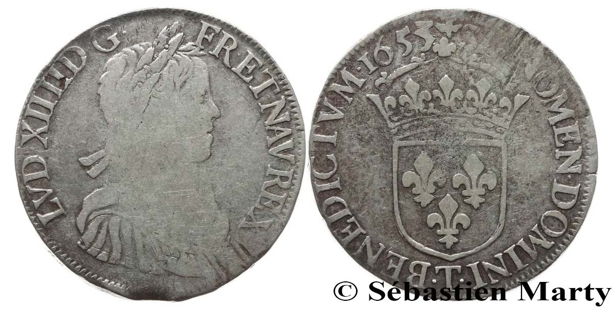 Monsieur Sébastien Marty nous a aimablement envoyé la photographie d’un écu de Louis XIV au portrait à la mèche longue frappé en 1653 à Nantes (T) (27 g, 40 mm). Cette monnaie avec une colombe du Saint-Esprit en début de légende du revers a été frappée sous le maître Jean de Marques. Cette monnaie était signalée d’après les archives dans l’ouvrage Monnaies royales et de la Révolution françaises (1610-1794), n° 33 115, p. 392, mais n’était pas retrouvée. D’après les archives, ces écus ont été délivrés entre le 4 janvier et le 12 mars 1653.