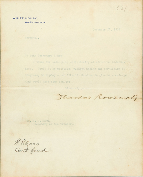 C'est le courrier adressé par le Président Roosevelt (Théodore, pas Franklin) au Secrétaire d'État Shaw, en décembre 1904, pour se plaindre de la 'hideur atroce' des types des monnaies américaines utilisées à l'époque et suggérer de confier à Augustus Saint-Gaudens la création de nouveaux types monétaires. Cliquez pour voir le lot sur le site d'Heritage.