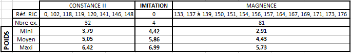 CGB ayant commercialisé 4 exemplaires de cette imitation (2), nous en connaissons la métrologie. J’ai donc pu comparer leurs poids avec, d’une part, les monnaies de Constance II de même type des années 349-350 (réf. AMA 1120 à 1141), et d’autre part, celles de Magnence des années 350-352 (AMA 1254 à 1279). Les données proviennent de 113 exemplaires enregistrés dans la base Nummus Bible II, soit 32 pour Constance II et 81 pour Magnence :